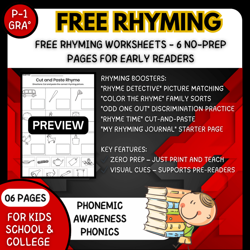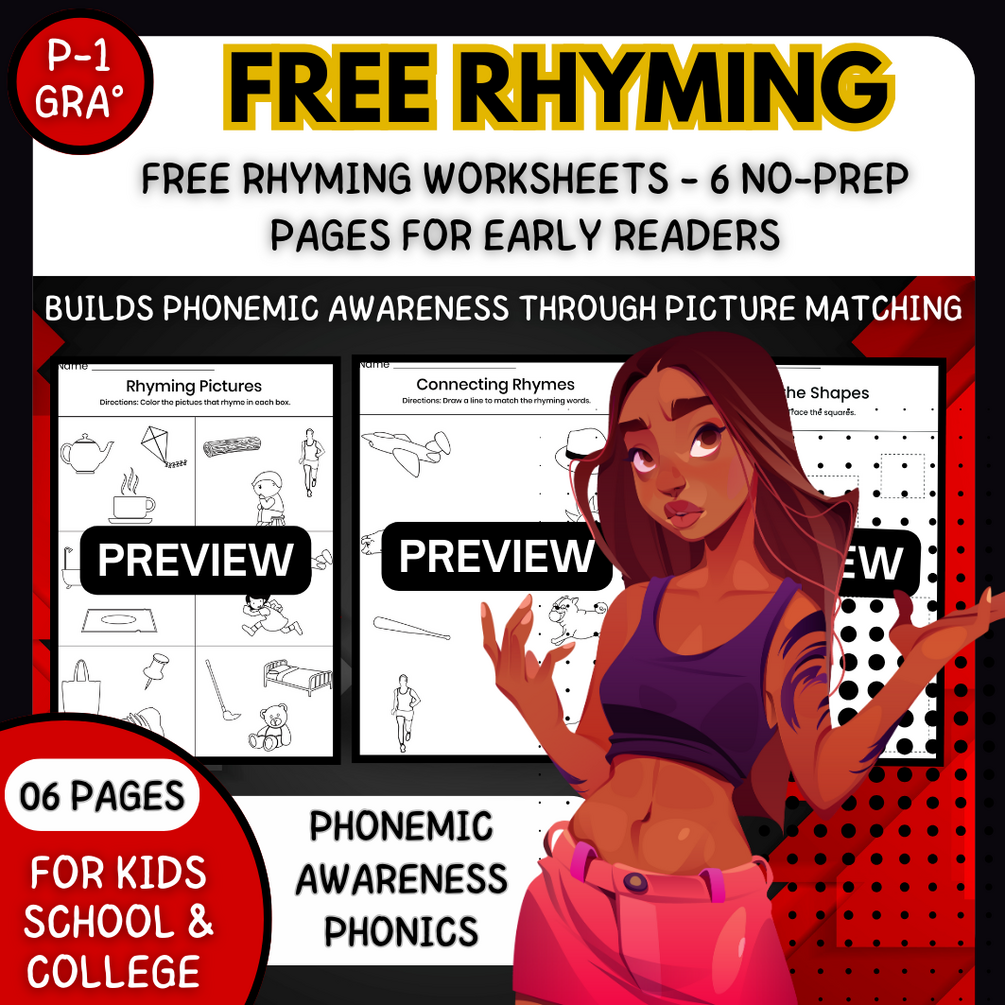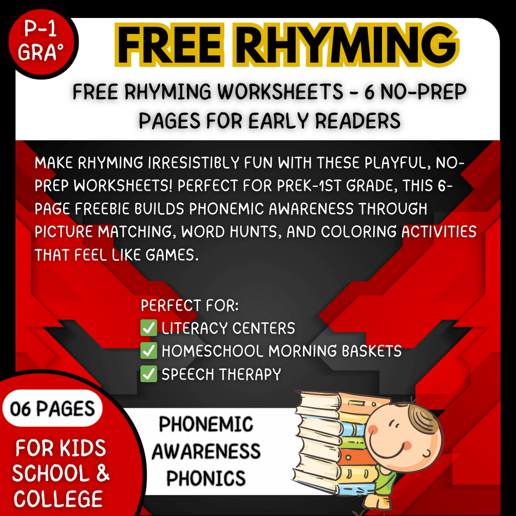 Make rhyming irresistibly fun with these playful, no-prep worksheets! Perfect for PreK-1st grade, this 6-page freebie builds phonemic awareness through picture matching, word hunts, and coloring activities that feel like games.